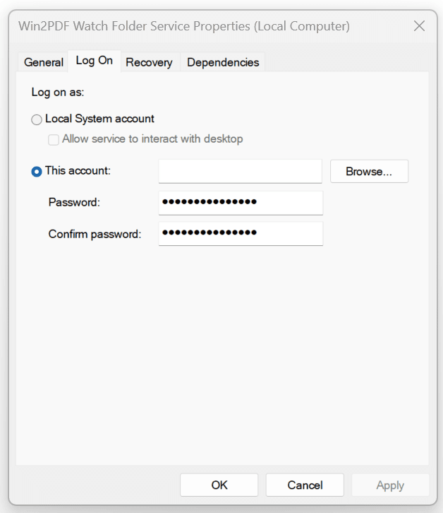 Win2PDF Desktop - Watch Folder Service User Log On